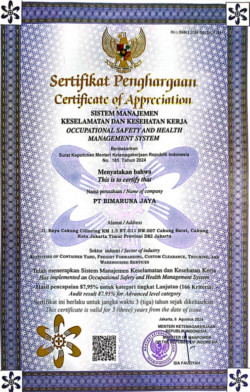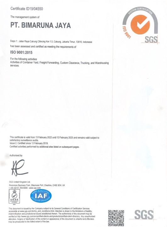 The ISO 9001 certification assures our clients that PT. BRJ is committed to the highest international standards of quality management. It confirms our ability to deliver reliable, high-quality, and consistently managed logistics solutions, thereby maximizing efficiency and minimizing errors in the supply chain.